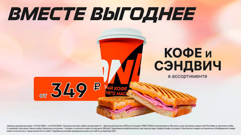 В акции участвует кофе - Американо, Капучино, Ванильный капучино, Латте, Мокачино - стаканчики 230 мл и Сэндвич YORK FRESH в ассортименте: Ветчина и сыр; Цыплёнок пикантный; Ростбиф на зерновом хлебе; С индейкой; Цыплёнок, бекон и яйцо; Буженина и огурчики, С лососем, С тунцом.
